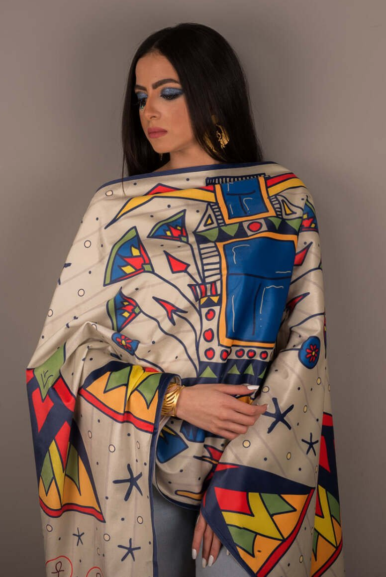 “She is a designer who loves her customers and value her art. I'm so happy with this shawl and couldn't wait till I reach home to try it on. It starts with the beautiful packaging, then the amazing material, and the beautiful Egyptian design. Colors are so vivid in reality. Thanks Nada Mohsen for the amazing piece of art, keep the good work up.”